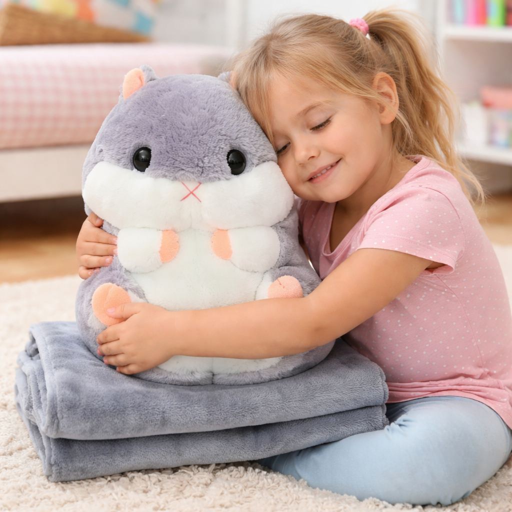 ✅2 w 1 – maskotka + koc: chomik skrywa w sobie duży, wygodny koc o wymiarach 100x140 cm – gotowy, by Cię ogrzać.