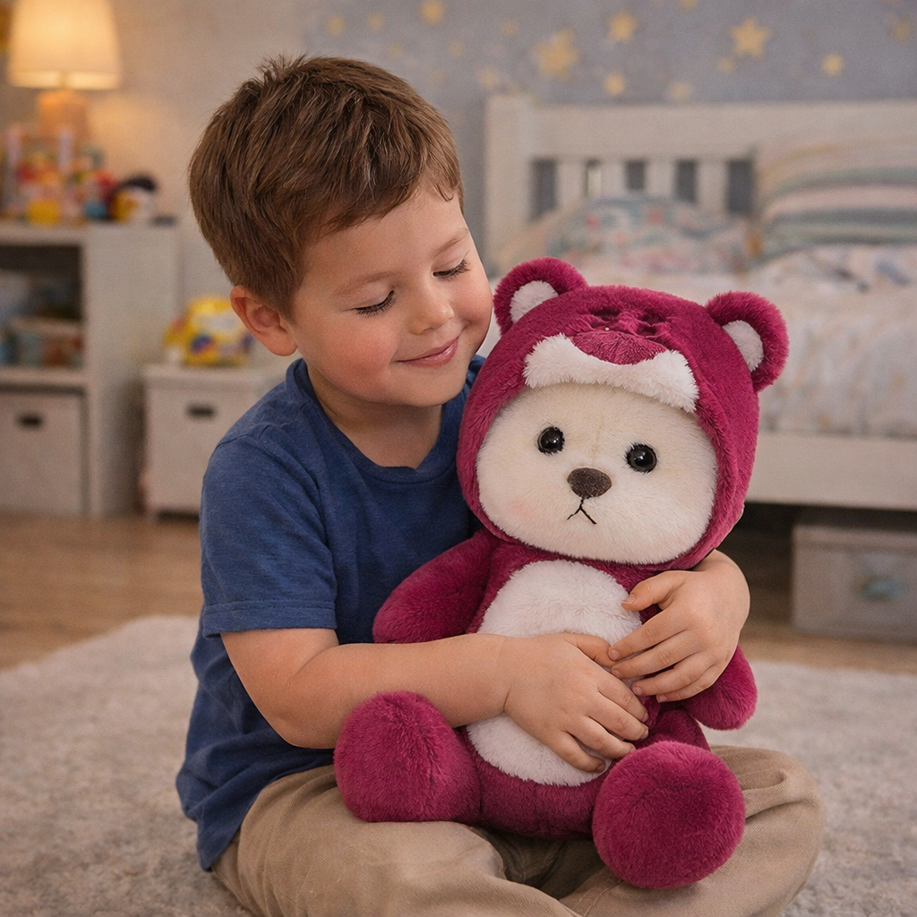✅Wyjątkowość tej maskotki tkwi w szczegółach – piękny, głęboki czerwony kolor przyciąga wzrok, a ściągany kaptur dodaje jej charakteru i uroku. Miś wygląda cudownie zarówno z kapturem, jak i bez niego, co sprawia, że będzie ozdobą każdego pokoju, dziecięcego łóżeczka czy salonowej kanapy.